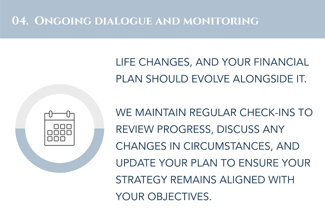 Our work begins by building a deep understanding of each client’s personal goals, values, and financial objectives. Whether you’re planning for retirement, navigating a life transition, or considering charitable giving strategies, our process is designed to be both comprehensive and adaptive to your evolving needs.